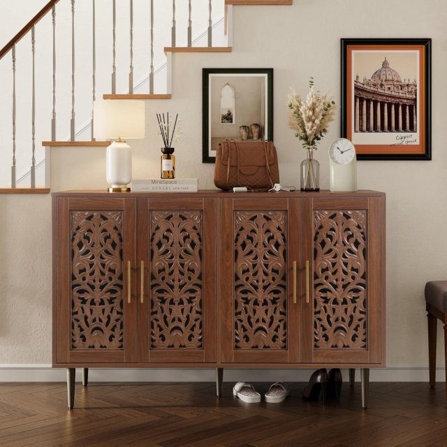 Elevate your living space with this 47.8″ Accent Cabinet featuring exquisite vintage charm. Designed with intricate hollow carvings and a warm wood finish, this buffet cabinet blends classic craftsmanship with modern practicality. Whether your home embraces a mid-century flair or French country elegance, this piece will instantly become the centerpiece of any room.