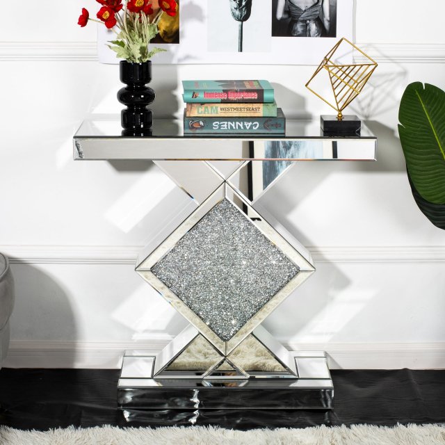 The console table stands out with its unique diamond-shaped pedestal base, beautifully inset with sparkling crystals. This sculptural design doesn’t just support the tabletop — it transforms the piece into a true work of art. The rectangular top (31.5” L x 11.4” W) provides ample space to display your favorite décor: a lamp, floral arrangement, books, or framed photos. Its reflective surfaces and glittering details instantly bring a sophisticated sparkle to your home.